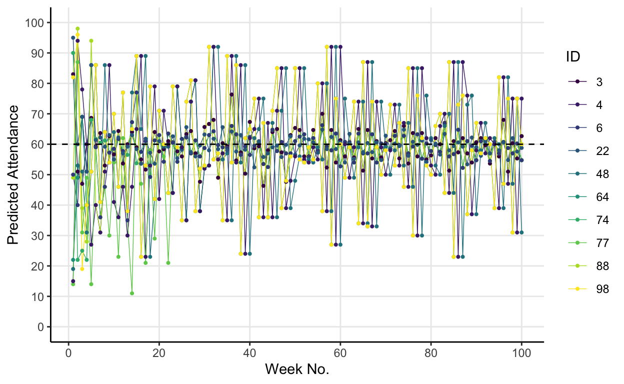 It’s a bit messy but the plot gets across Arthur’s point that the \(40:60\) ratio of hypotheses (that results in an average attendance of 60) is a consequence of different people being above and below the threshold each round. The trees change, but the forest remains the same.