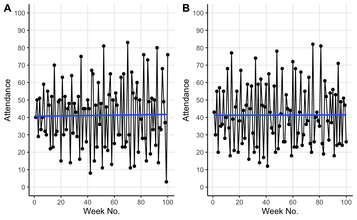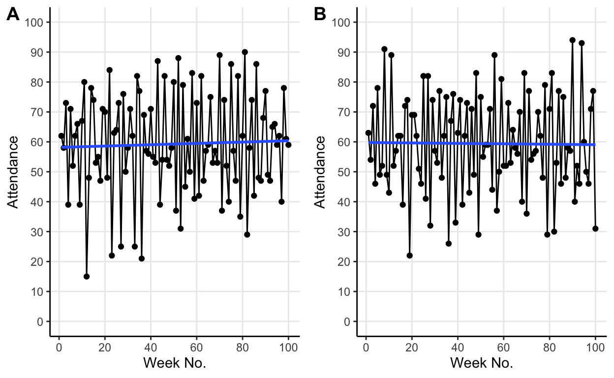 The blue line in the graph is a linear model of attendance over time. It shows us that, whilst weekly attendance fluctuates, the mean attendance converges on the default threshold value of 60.