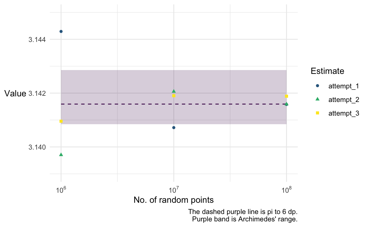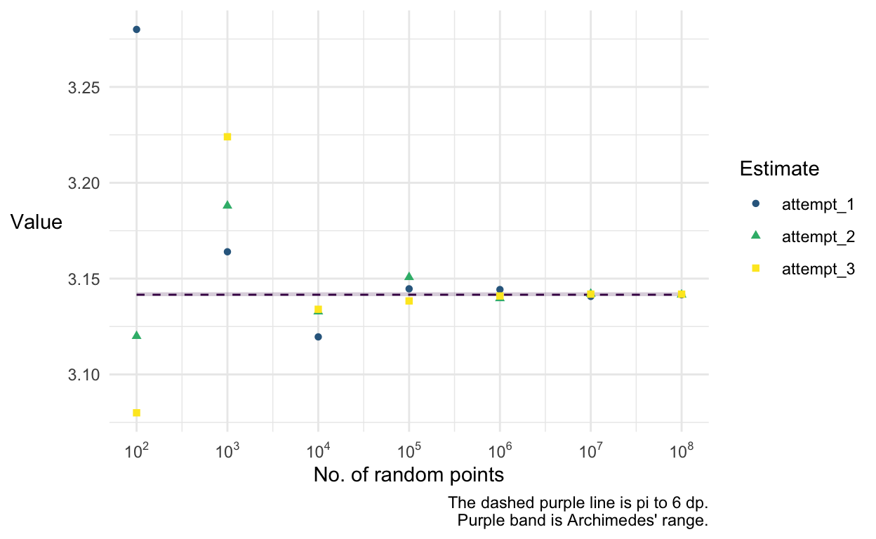 labs(caption = "The dashed purple line is pi to 6 dp.\nPurple band is Archimedes' range.") +