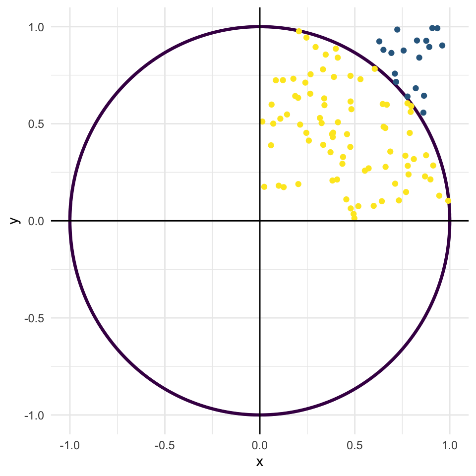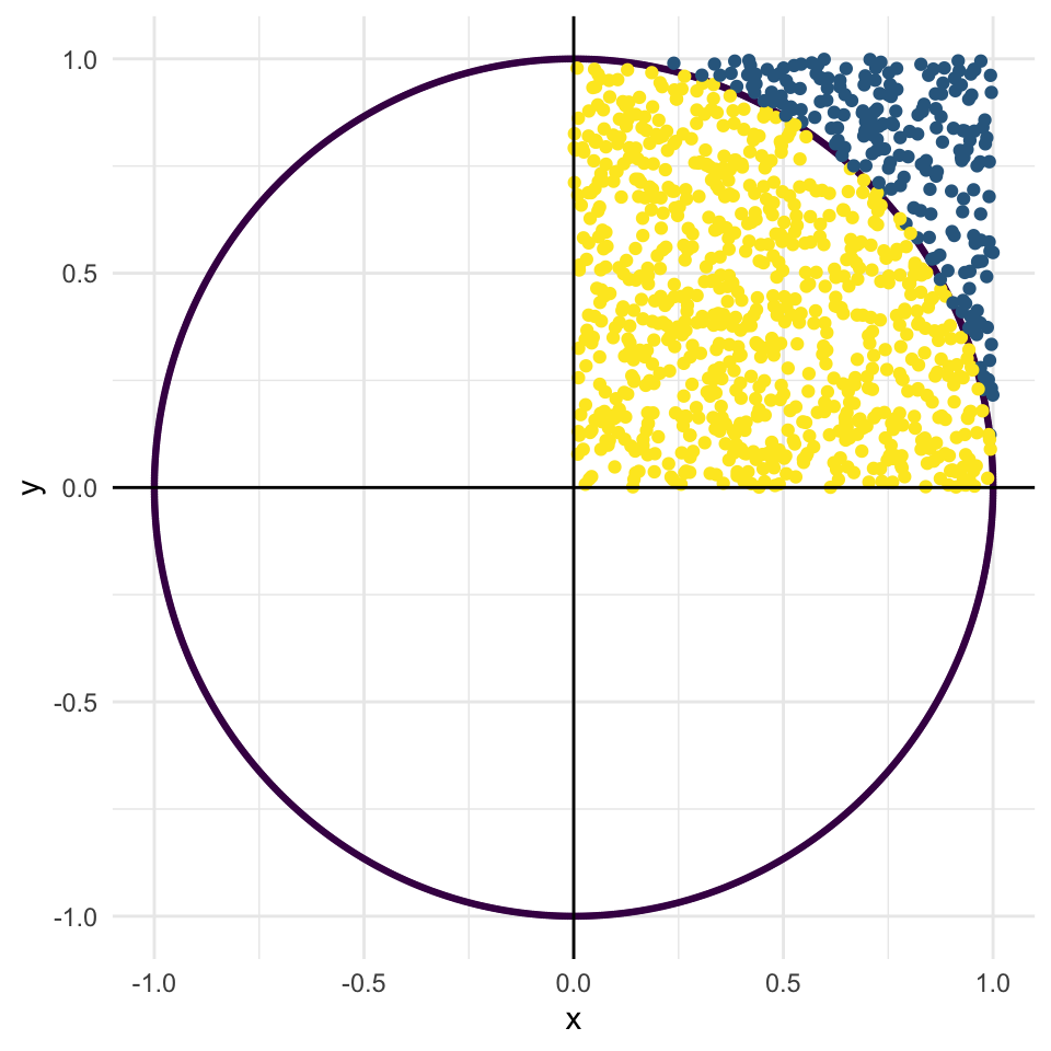 So we’ve got a process that can help us estimate \(\pi\). We overlay random points on one quarter of a circle, find out the proportion that fall inside the circle, and then multiply by 4.